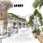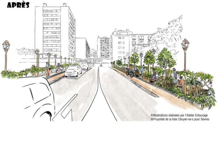 Une véritable entrée de ville transformée en place publique conviviale : gradins, scène, jardin, jeux pour enfants et vue sur l’église Saint-Romain. Un nouveau cœur battant pour Sèvres.