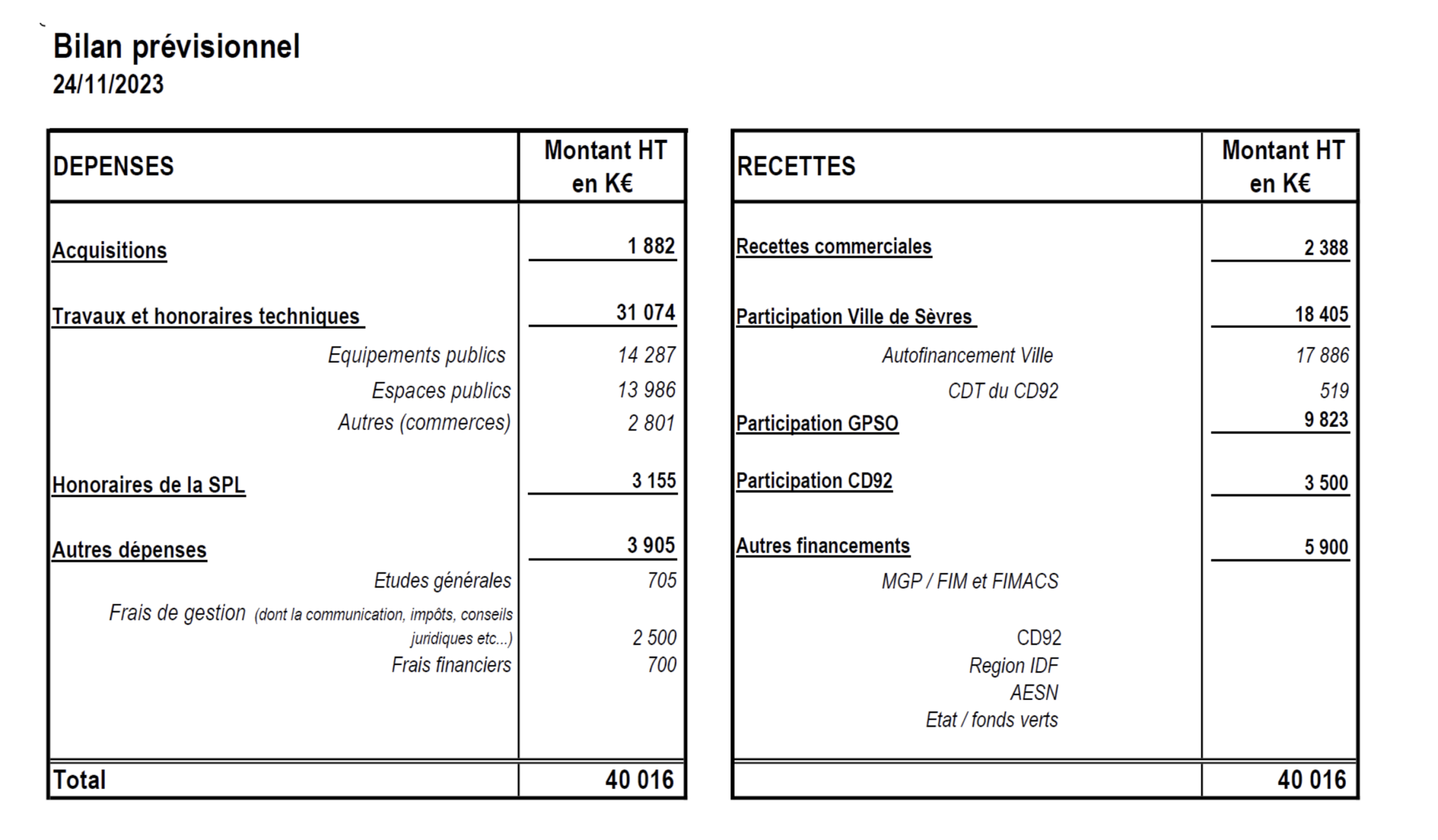 Que voit-on sur la première ligne des recettes : 2,388 M€ de recettes commerciales. Des recettes qui reposent sur la vente d’espaces commerciaux. Quand on sait qu’un quart des commerces de Sèvres est déjà fermé (cf mon article sur les fermetures de commerces à Sèvres) et que d’autres veulent partir, on peut s’interroger sur la fiabilité de ces recettes. Et cela d’autant plus que dans une première présentation du projet, le maire sortant n’avait pas hésité à tabler sur 4,5 M€ de recettes commerciales prévisionnelles ! Comme le budget total du projet a été revu à la baisse (de 43,8 M€ à 40 M€), il est revenu sur ses prévisions.