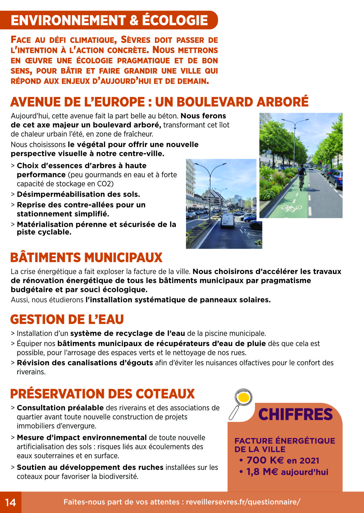 Face à l’explosion des coûts, nous agirons immédiatement sur votre pouvoir d’achat en créant une centrale d’achat d’énergie municipale pour réduire vos factures de gaz et d’électricité. Nous gèlerons également la fiscalité locale, après la hausse massive de 79 % de la taxe foncière subie depuis 2014. Votre sécurité sera assurée par une police municipale de proximité armée et un réseau de vidéoprotection doublé. Enfin, nous protégerons votre santé en facilitant l’installation de médecins spécialistes et en créant une mutuelle communale à tarifs négociés.