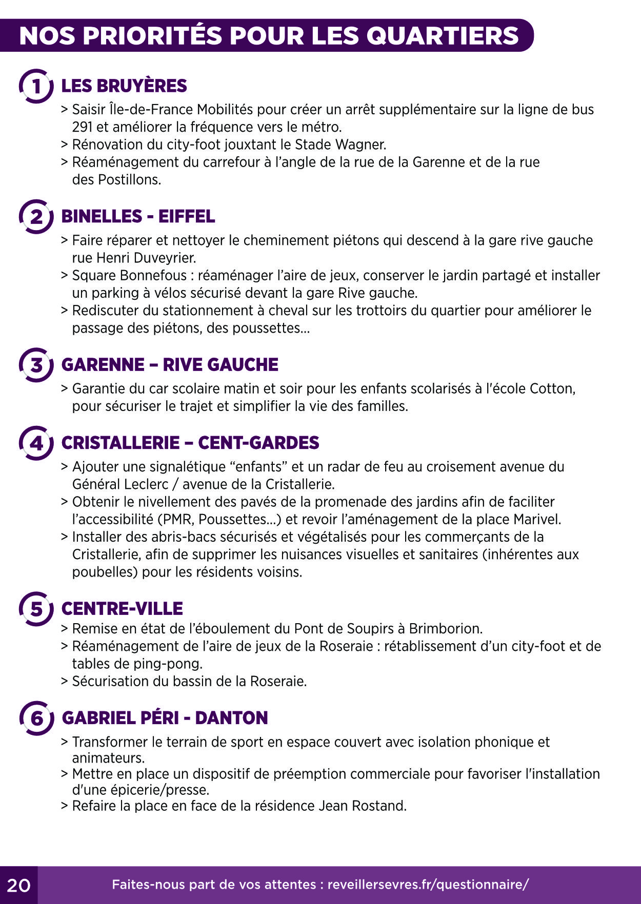 Le maire sortant, après être revenu sur son engagement de 2014 de ne faire que deux mandats, propose aujourd’hui de prolonger un pouvoir qui a délaissé l’essentiel : la vitalité de nos commerces, la protection des habitants, l’épanouissement de notre jeunesse et la cohésion de nos quartiers. Malgré le rayonnement mondial de notre Manufacture, Sèvres souffre d’un déficit d’attractivité et glisse progressivement vers un statut de ville-dortoir.