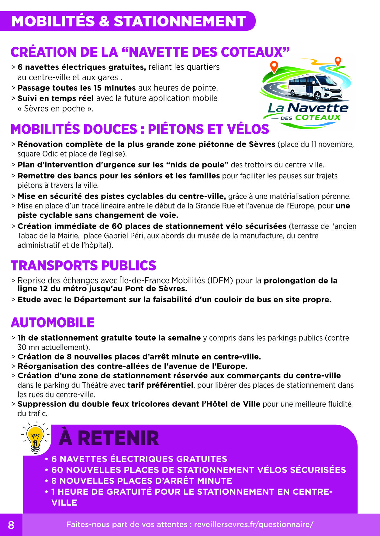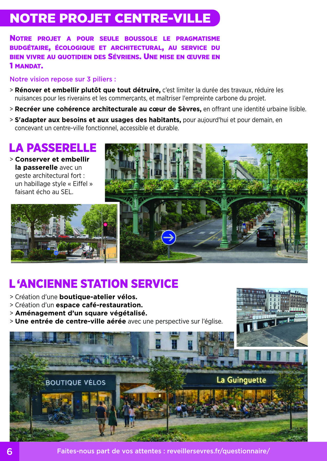 Le réveil de Sèvres commence par son Cœur de Ville. Contrairement au projet municipal actuel, coûteux et destructeur, nous avons choisi de rénover et d’embellir l’existant. Nous rénoverons le Marché Saint-Romain et habillerons la passerelle d’un style « Eiffel » pour redonner une identité forte à notre centre. Nous instaurerons une participation citoyenne réelle et déploierons la « Navette des Coteaux», électrique et gratuite, pour relier chaque quartier aux gares et aux commerces.