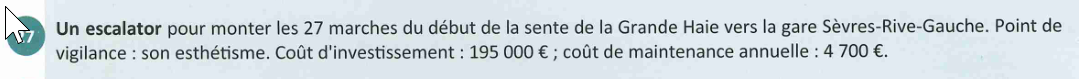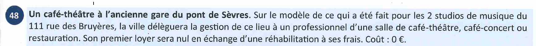 NB : La gare du Pont de Sèvres avait été expressément acquise par le maire précédent François Kosciusko-Morizet pour devenir un lieu d’animation. Grégoire de la Roncière faisait alors partie du conseil municipal. Adjoint à l’urbanisme il avait voté en faveur de cette acquisition.