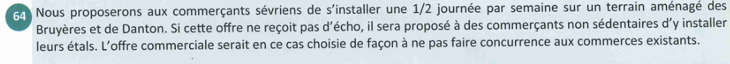 La saga de la rénovation du marché Saint Romain : en 2017 le maire sortant avait fait voter les Sévriens autour de la rénovation du marché à son emplacement. En 2020, il proposait de le déplacer au rez-de chaussée du bâtiment administratif. En 2023, il proposait de reconstruire le marché sur l’emplacement de la station BP tout en détruisant le pont du 8 mai 45 pour laisser suffisamment de place à ce nouveau marché. En 2026, il propose désormais un vote autour de la destruction du pont. S’il était maintenu, il faudrait revoir les plans du nouveau marché !